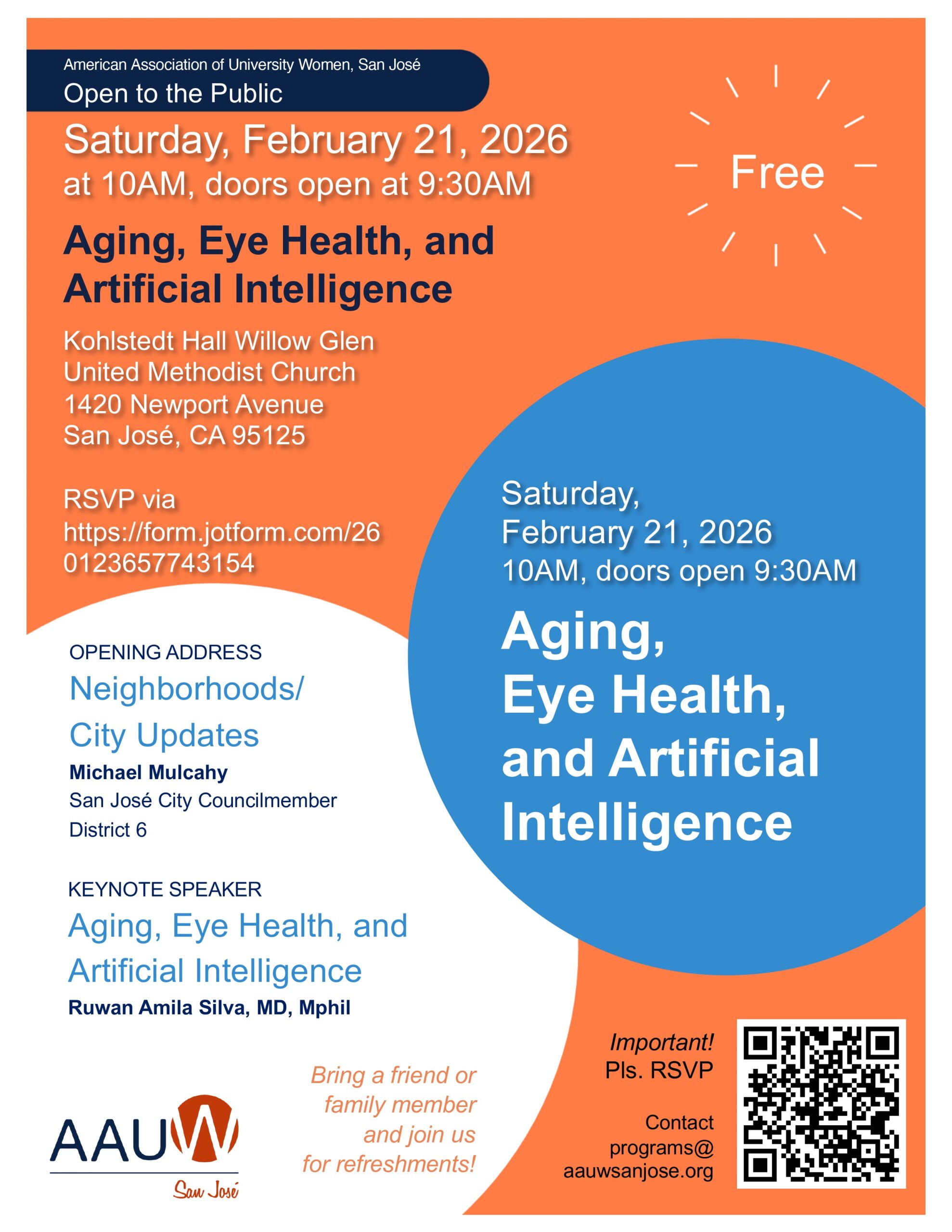 Join AAUW San Jose Branch for a cup of coffee and to get updates on our community from our D6 Councilmember Michael Mulcahy, and to also learn about eye health from our second speaker Ruwan Amila Silva, MD, who will review aging, eye health, and how artificial intelligence is used in the medical field.